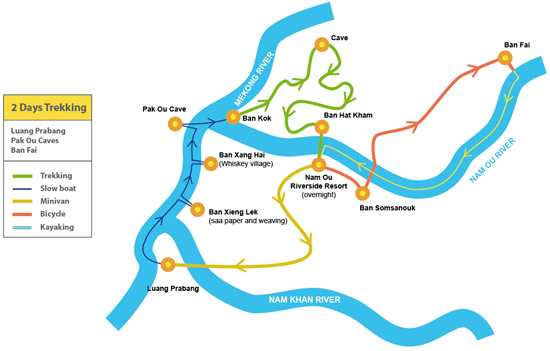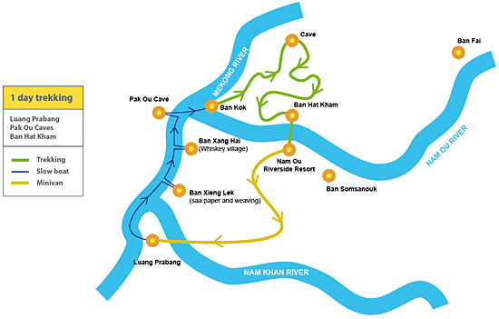 Boat Ride to Pak Ou / Trek to Ban Hat Kham / Overnight on the Nam Ou Resort / Bike to Ban Fay / Kayak to Ban Vang Lae / Back to Luang Prabang by Minivan